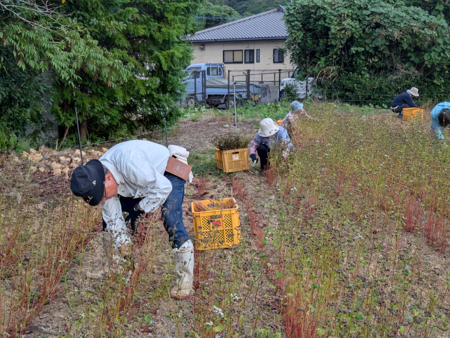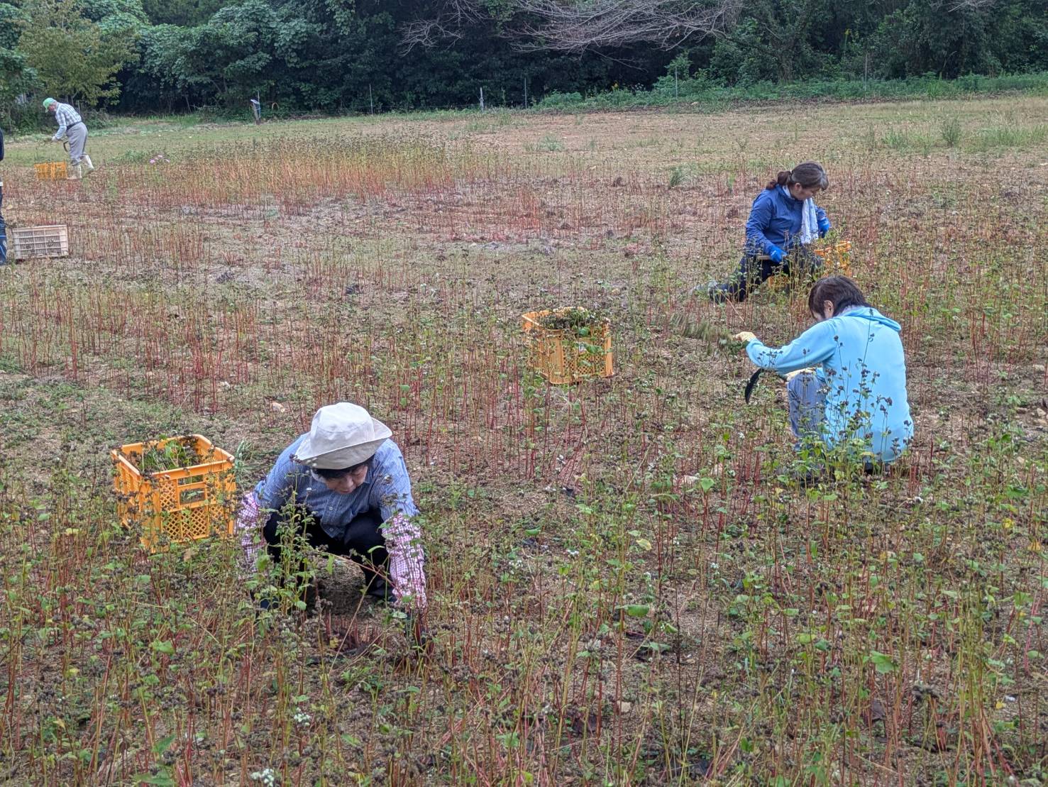 <そばの実の収穫(活動紹介)、実施場所:日当公民館横グラウンド、実施日:10月18日(日)9:00~10:00>