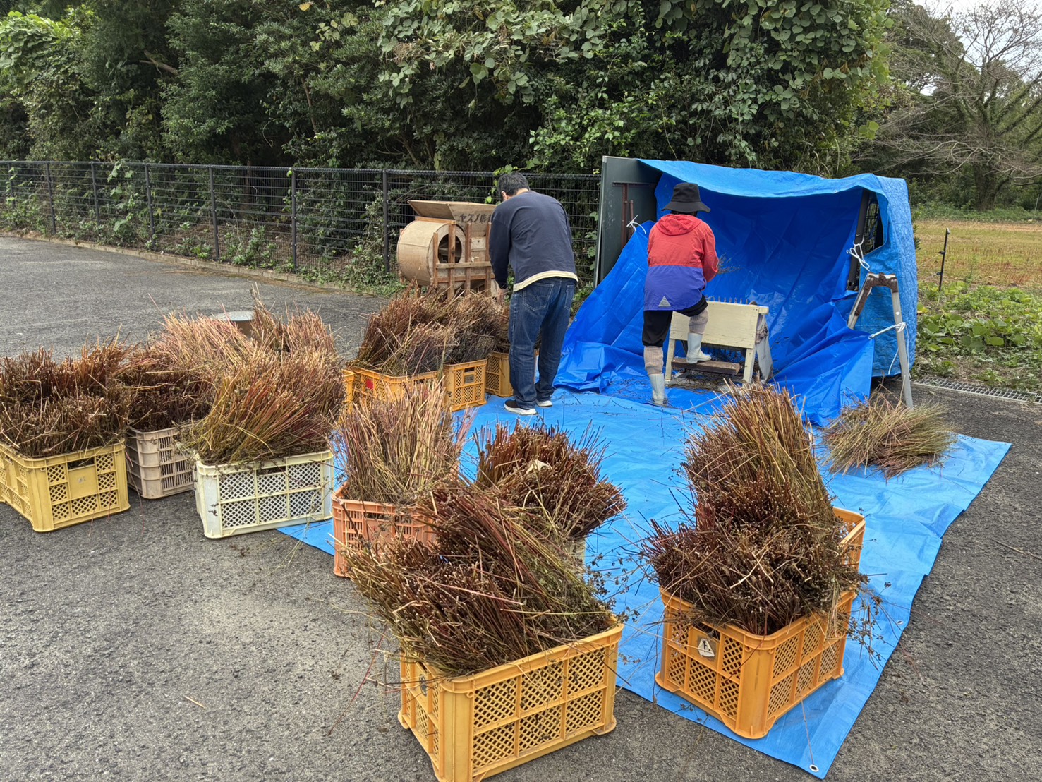 <そばの実の脱穀(活動紹介)、実施場所:日当公民館横グラウンド、実施日:10月25日(日)13:00~15:00>